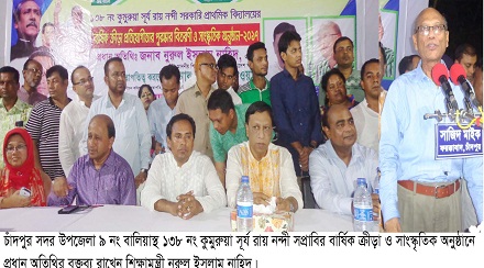 চাঁদপুর সদর উপজেলা ৯নং বালিয়াস্থ ১৩৮ নং কুমুরুয়া সূর্য রায় নন্দী সরকারি প্রাথমিক বিদ্যালয়ের বার্ষিক ক্রীড়ার পুরস্কার বিতরণ ও সাংস্কৃতিক অনুষ্ঠান শুক্রবার রাতে বিদ্যালয় প্রাঙ্গণে অনুষ্ঠিত হয়েছে। এতে প্রধান অতিথির বক্তব্য রাখেন গণপ্রজাতন্ত্রী বাংলাদেশ সরকারের শিামন্ত্রী নুরুল ইসলাম নাহিদ।