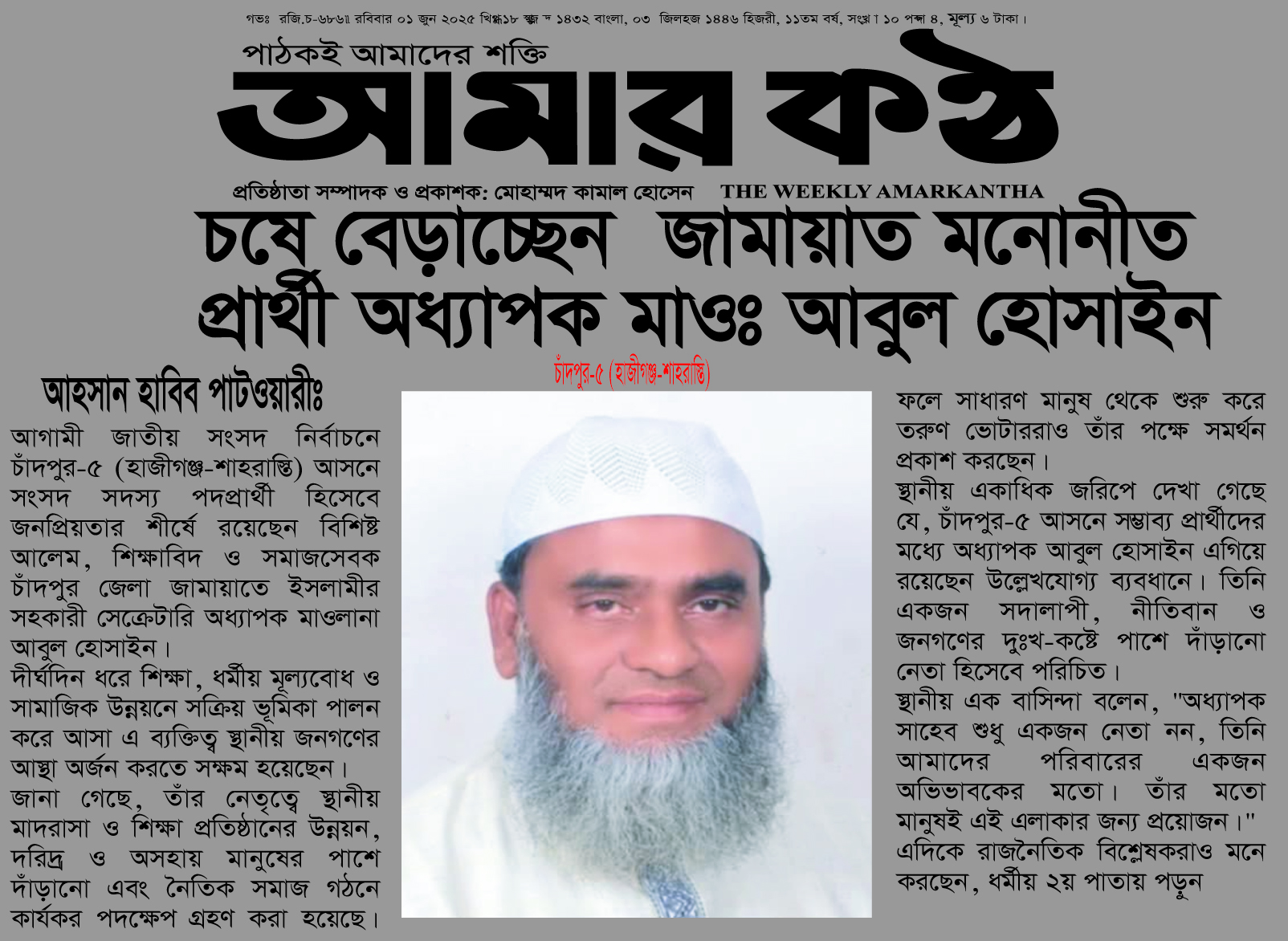 দীর্ঘদিন ধরে শিক্ষা, ধর্মীয় মূল্যবোধ ও সামাজিক উন্নয়নে সক্রিয় ভূমিকা পালন করে আসা এ ব্যক্তিত্ব স্থানীয় জনগণের আস্থা অর্জন করতে সক্ষম হয়েছেন।